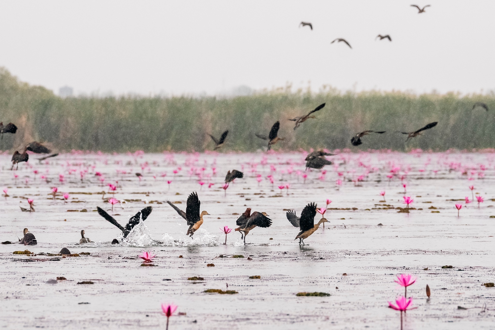 สองข้างทางยังเต็มไปด้วยนกน้ำบินโฉบไปมา เพิ่มชีวิตชีวาให้ทุ่งบัวแดงยิ่งขึ้นไปอีก