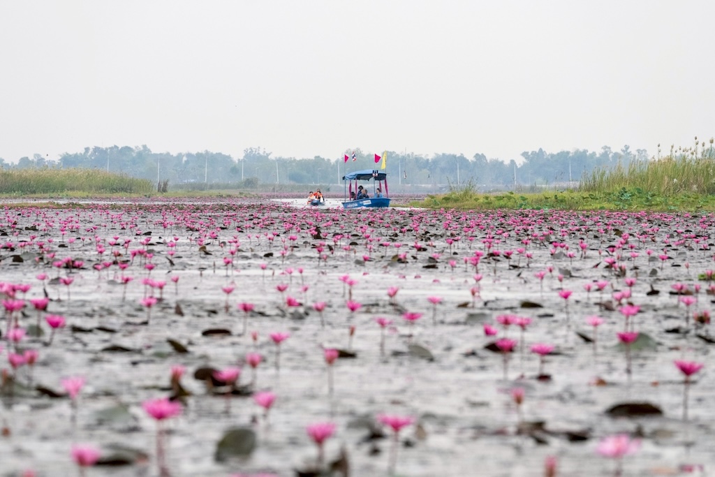 เมื่อเรือแล่นผ่านผืนน้ำกว้าง คุณจะได้เห็นดอกบัวแดงบานสะพรั่งทั่วท้องน้ำ สวยจนต้องหยิบกล้องขึ้นมาถ่ายแบบไม่หยุดมือ ไม่ว่าจะเป็นภาพระยะไกลแบบพาโนรามา หรือมุมใกล้ที่เห็นกลีบสีชมพูชัดเต็มตาก็งดงามไม่แพ้กัน