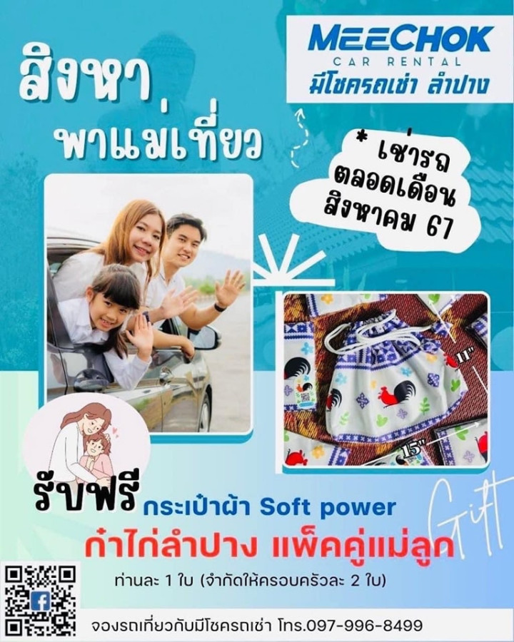 📌 เพียงจองรถกับ มีโชครถเช่า ลำปาง ตลอดเดือนสิงหาคม 2567 นี้ รับไปเลย กระเป๋าผ้า Soft power ลายก๋าไก่ลำปาง แพ็คคู่แม่ลูก ท่านละ 1 ใบ (จำกัดให้ครอบครัวละ 2 ใบ) มาแอ่วกั๋นเน้อ! 🌟🚗💼
