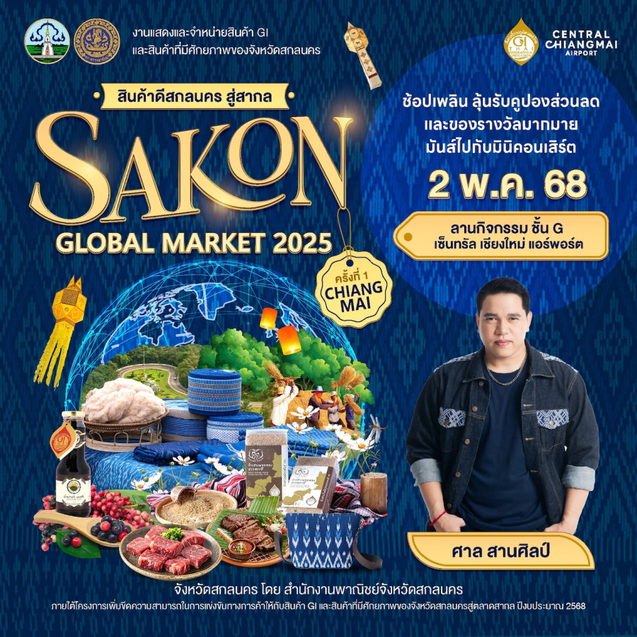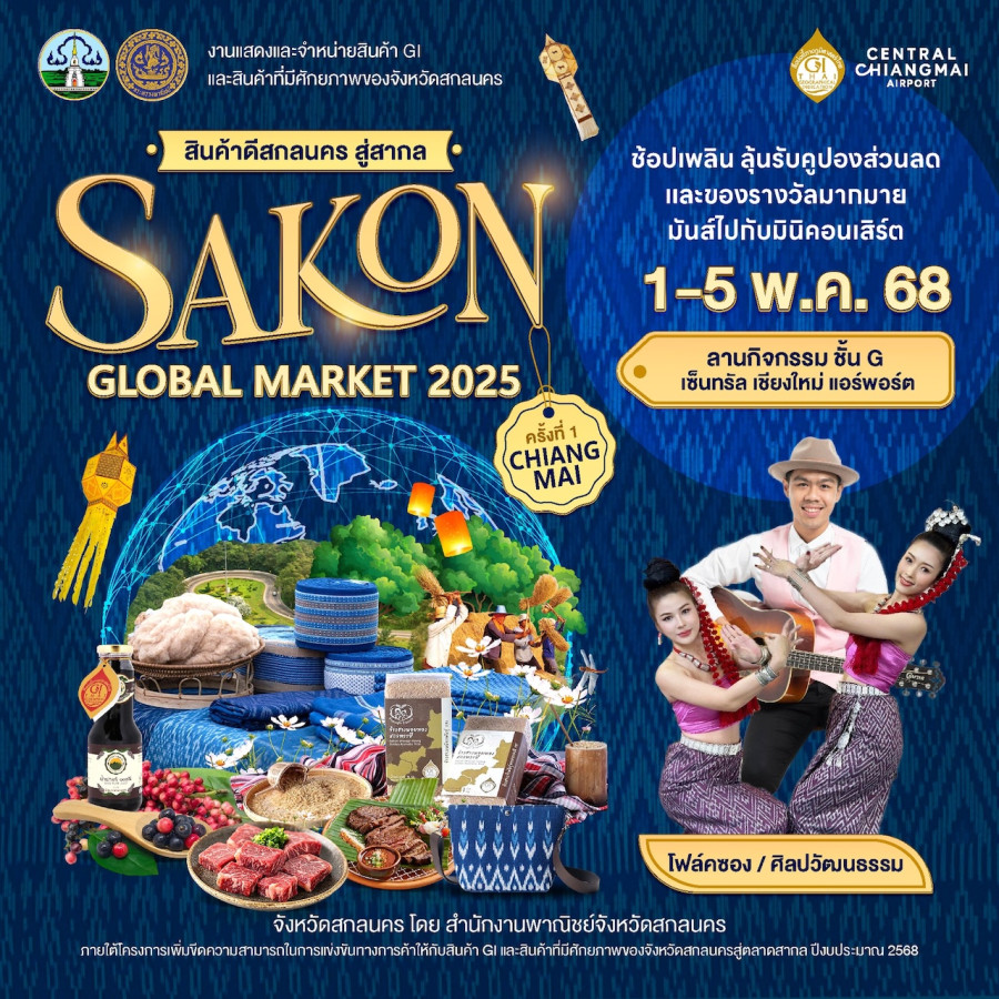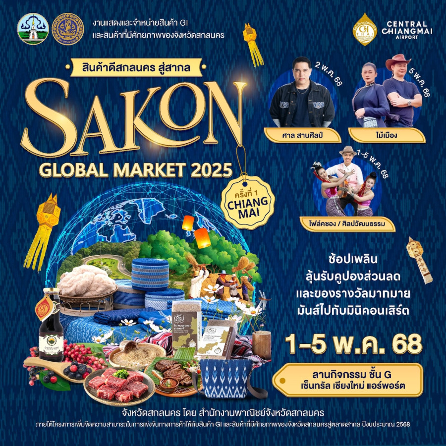 เตรียมตัวให้พร้อม! 🎉 ชาวเชียงใหม่และนักท่องเที่ยวทุกคน มาร่วมสัมผัสเสน่ห์ของ “สกลนคร” ผ่านสุดยอดสินค้าและวัฒนธรรมท้องถิ่น ในงาน “สินค้าดีสกลนคร สู่สากล SAKON Global Market 2025” ที่จะเนรมิตพื้นที่ภายในศูนย์การค้าเซ็นทรัล เชียงใหม่ แอร์พอร์ต ให้กลายเป็นแหล่งช้อป ชิม ชิลล์ ของดีแห่งภาคอีสาน! 🌾✨