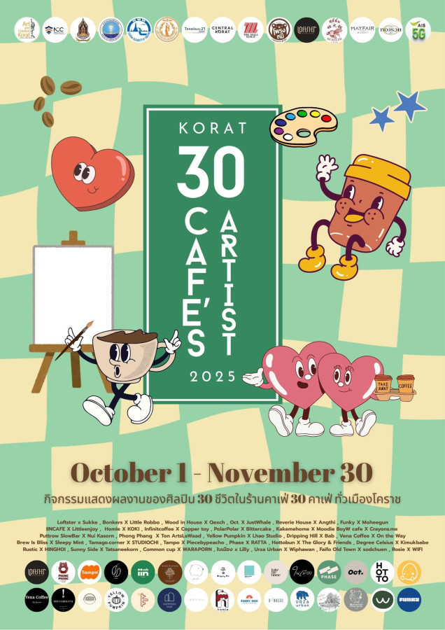งาน Korat 30 CAFE 30 ARTISTS 2025 คือเทศกาลศิลปะที่รวมความคิดสร้างสรรค์จาก 30 ศิลปินทั่วประเทศ มาพบกับบรรยากาศสุดชิลของ 30 คาเฟ่ดังในโคราช ตลอด 1 ตุลาคม – 30 พฤศจิกายน 2568