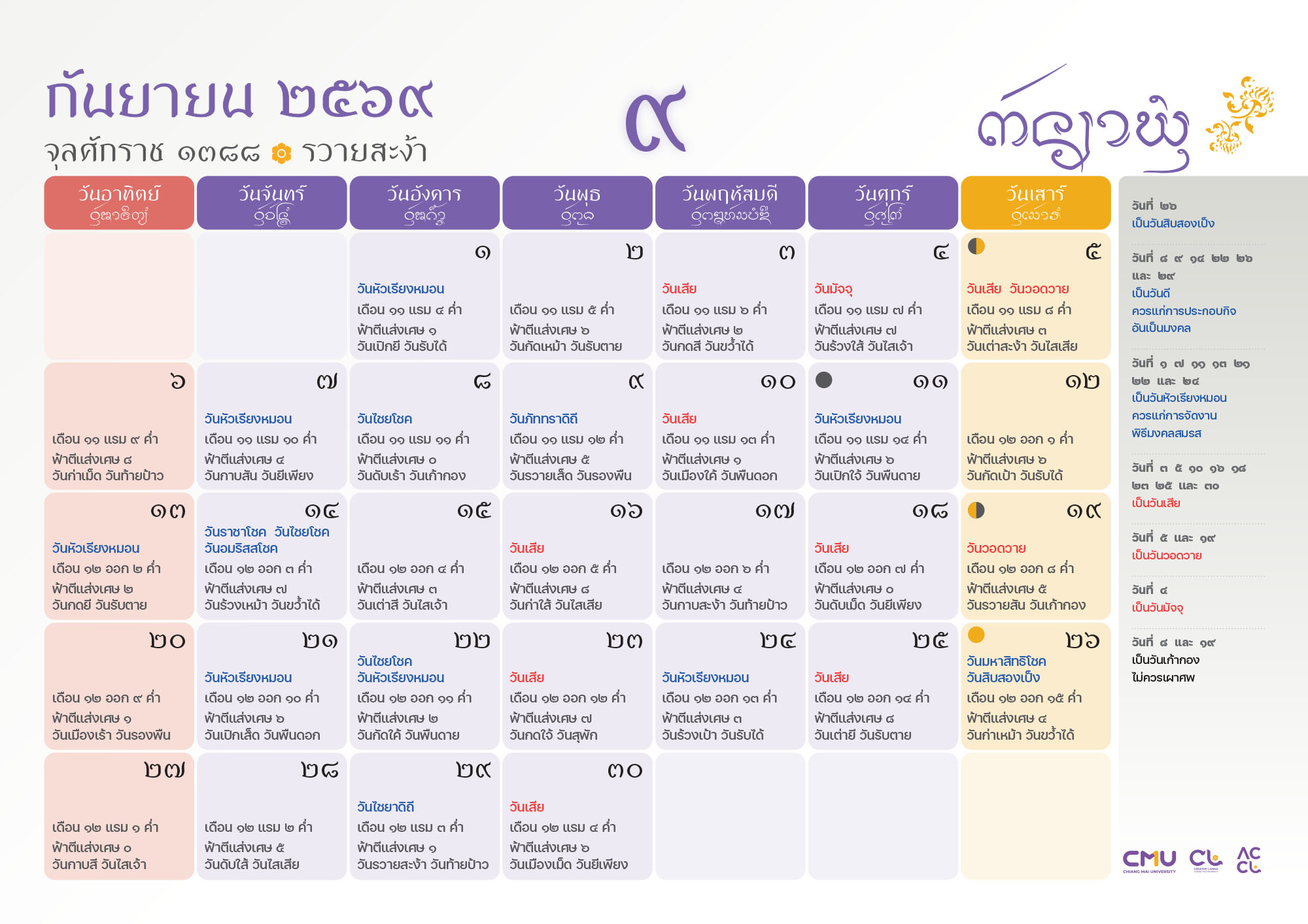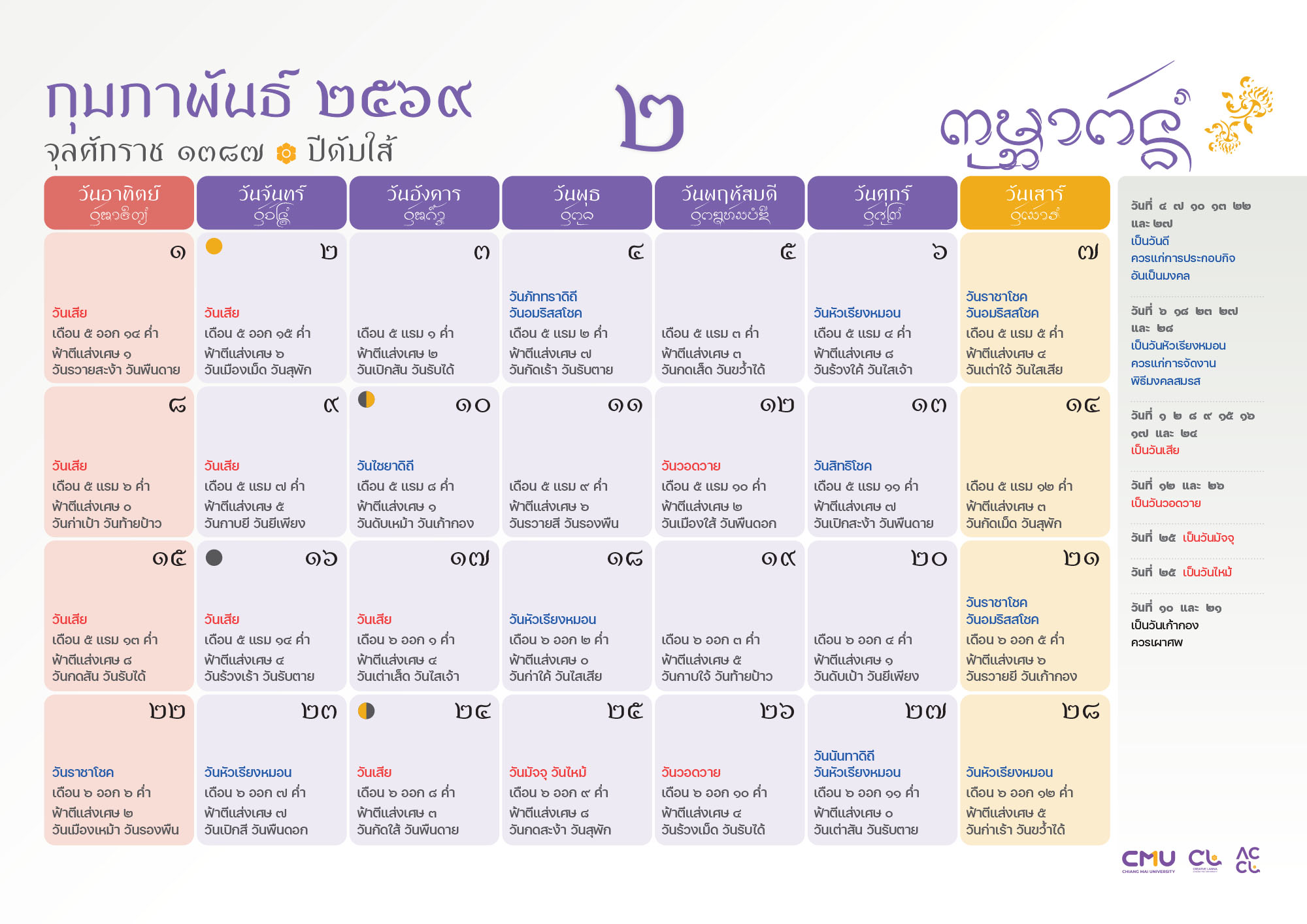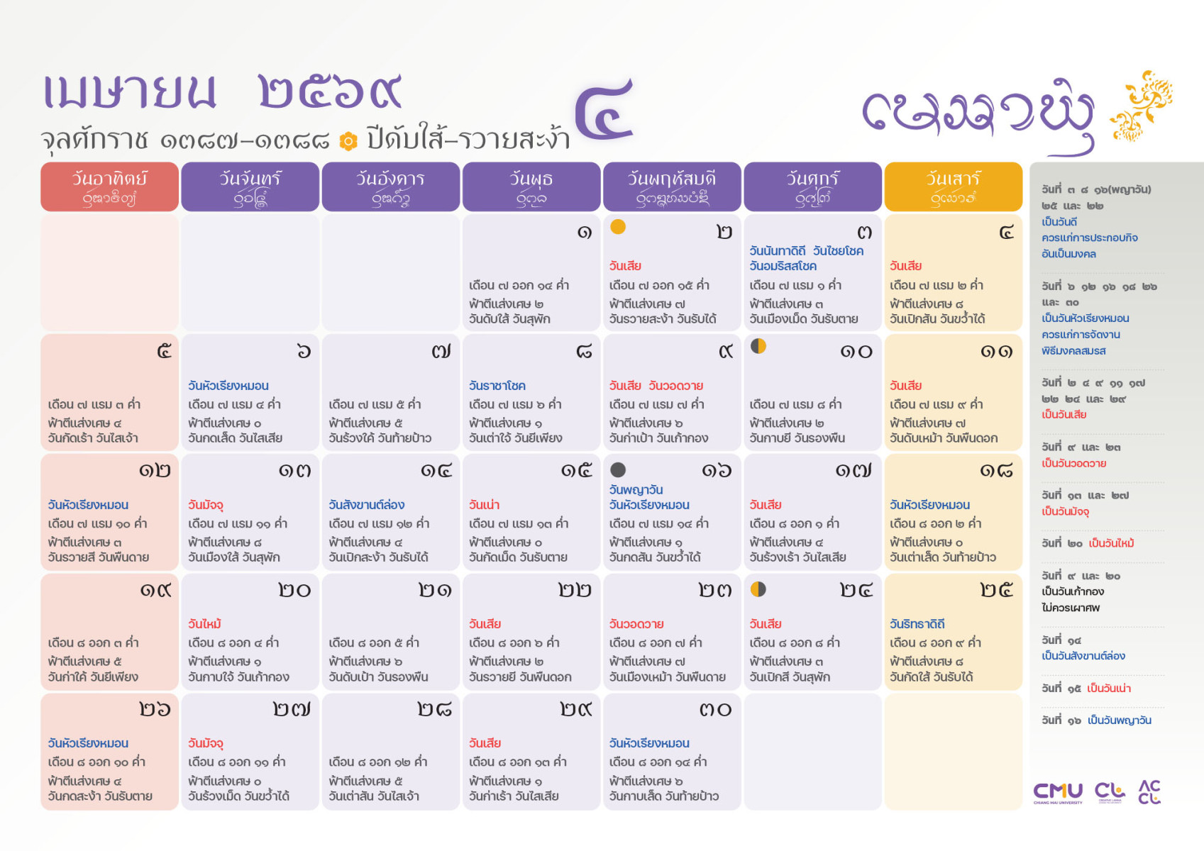 ดาวน์โหลดฉบับเต็มได้ที่: https://accl.cmu.ac.th/Lanna/calendarDownload/2569