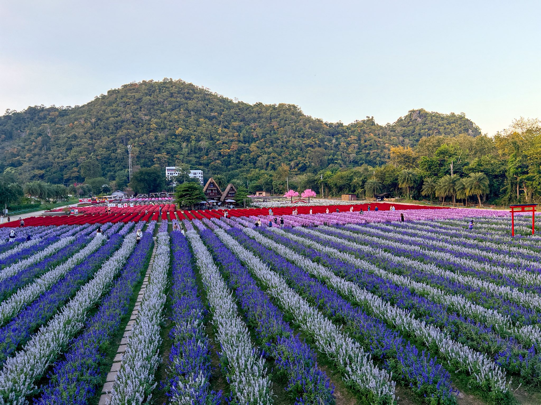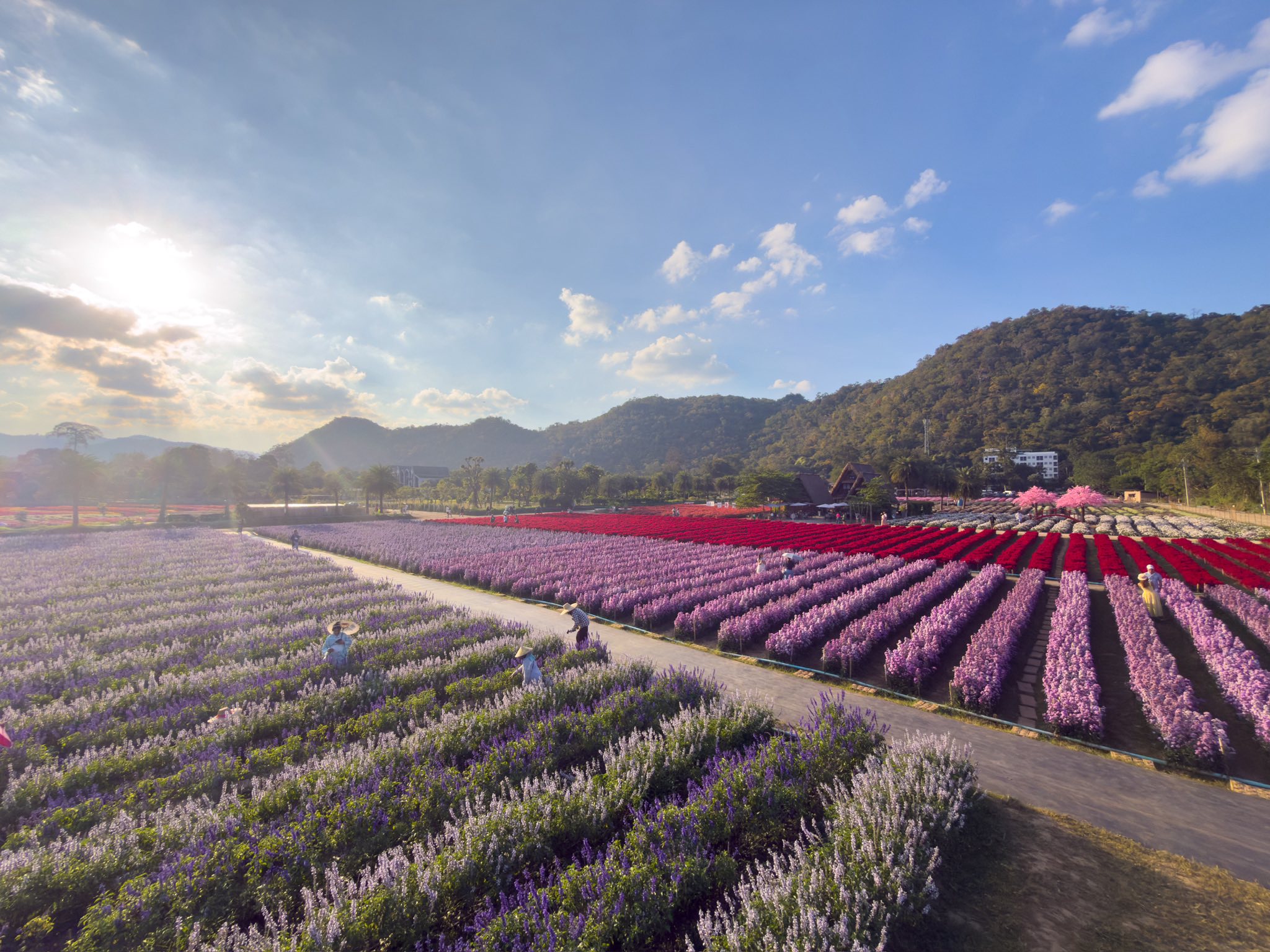 ดอกไม้จัดเป็นทิวแถวกว้างสุดสายตา สวยเหมือนอยู่ฮอกไกโดจริง ๆ โดยเฉพาะช่วงแดดเช้าและก่อนพระอาทิตย์ตก 🌾🌤️