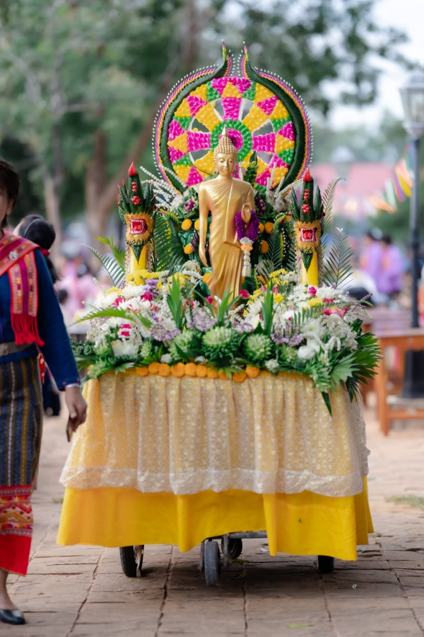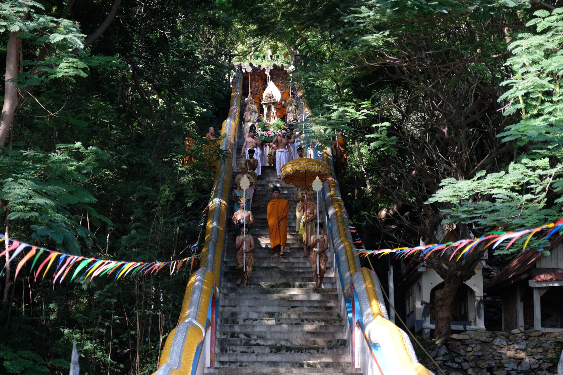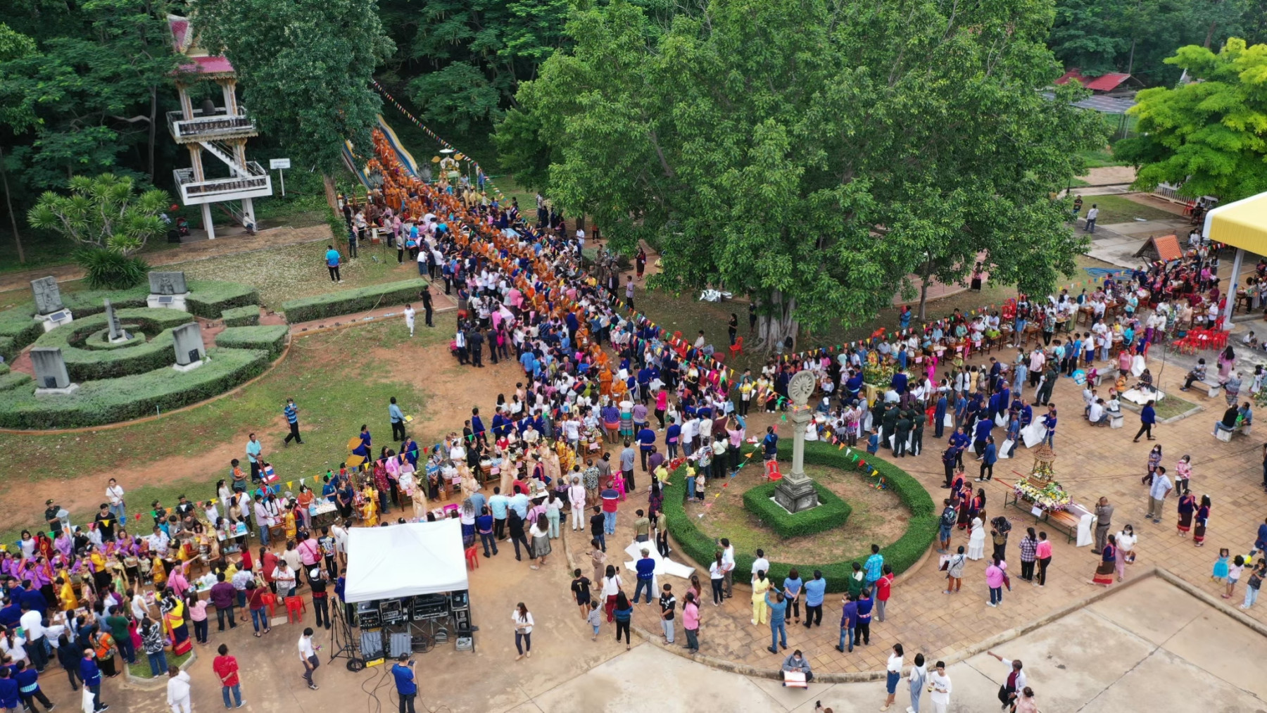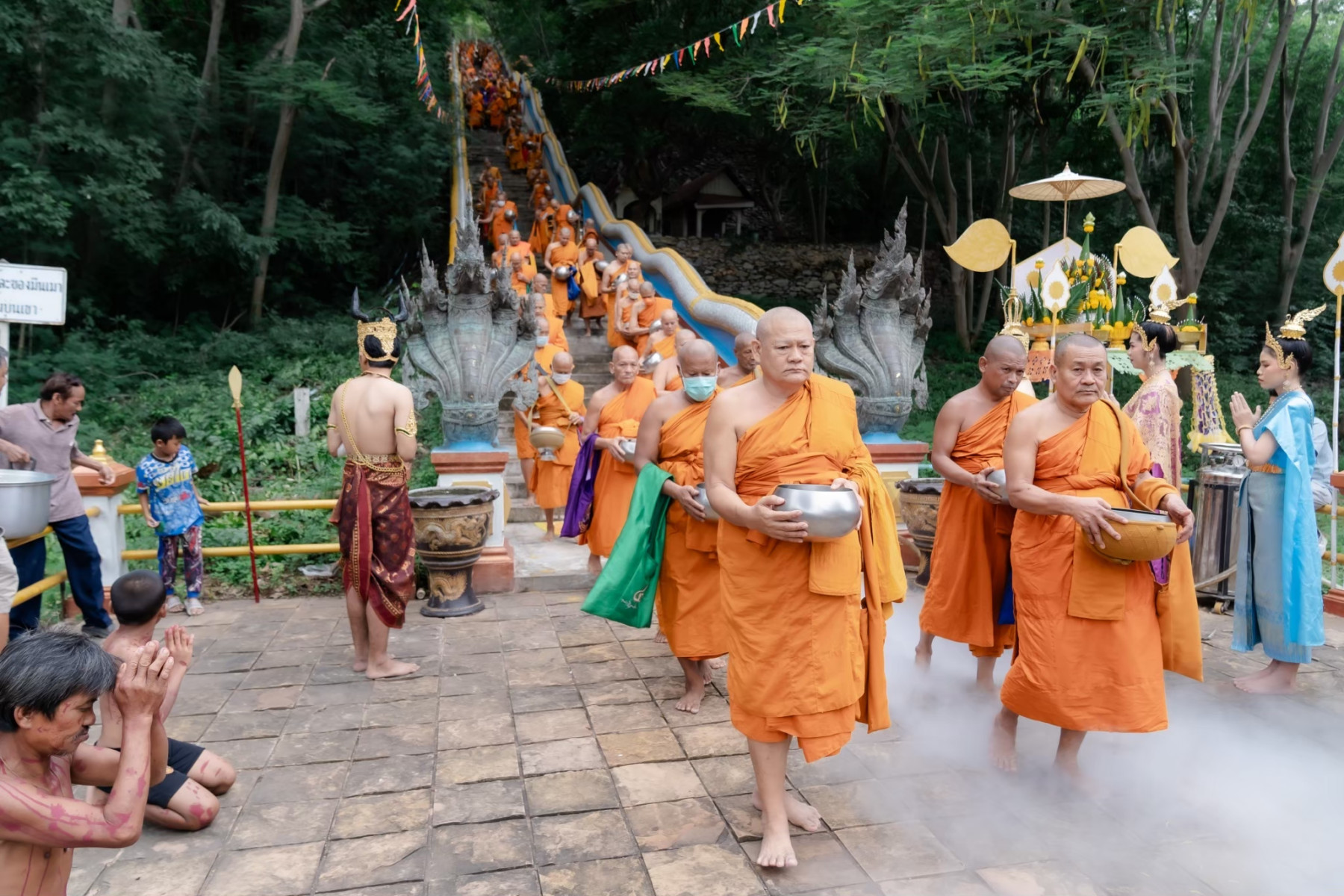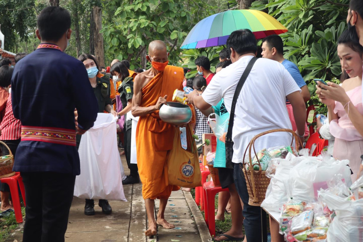 🙏 พิธีตักบาตรข้าวสารอาหารแห้งจะมีพระภิกษุสงฆ์จำนวน 100 รูป ลงมาจากมณฑปที่ประดิษฐานรอยพระพุทธบาทตามบันไดนาค เพื่อรับบาตร พร้อมด้วยขบวนเสลี่ยงพระพุทธ, เทวดา, นางฟ้า และการแห่ผ้าห่มเจดีย์พระบรมสารีริกธาตุจากสมัยทวารวดี