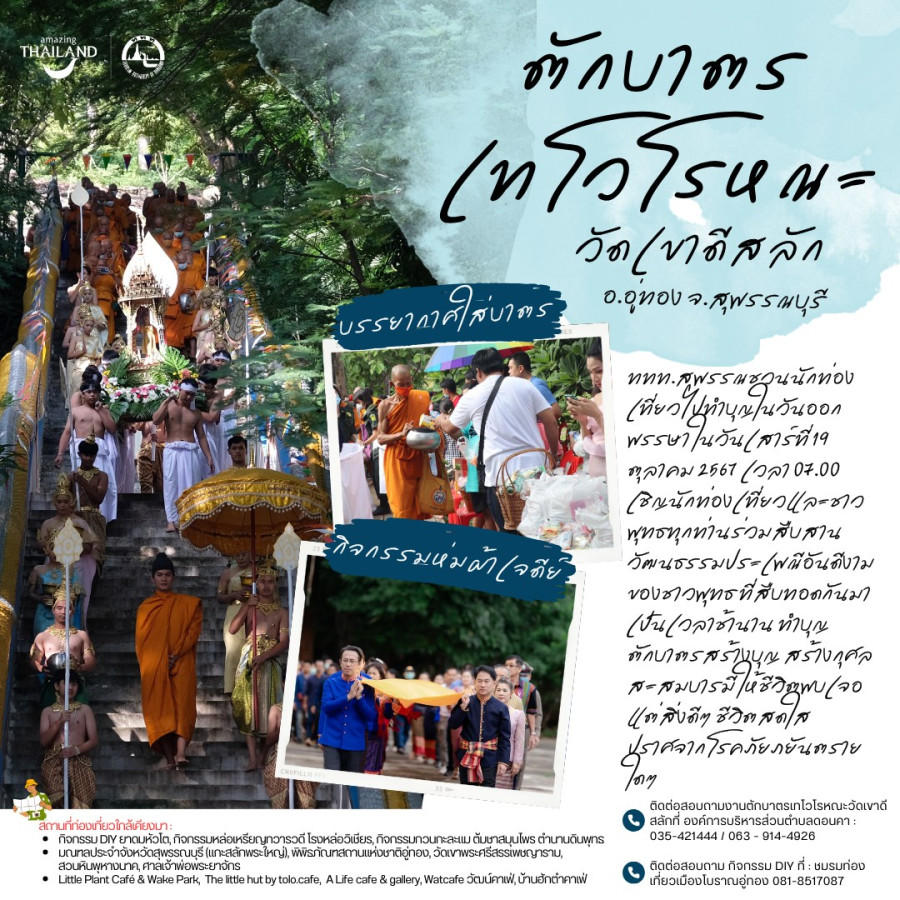 ในวันออกพรรษานี้, ททท.สุพรรณบุรีขอเชิญชวนนักท่องเที่ยวและชาวพุทธทุกท่านร่วมงานตักบาตรเทโวโรหณะวันเสาร์ที่ 19 ตุลาคม 2567 เริ่มตั้งแต่เวลา 07:00 น. ณ วัดเขาดีสลัก ตำบลดอนคา อำเภออู่ทอง จังหวัดสุพรรณบุรี ซึ่งเป็นงานที่สืบสานวัฒนธรรมและประเพณีอันดีงามของชาวพุทธที่มีมาช้านาน