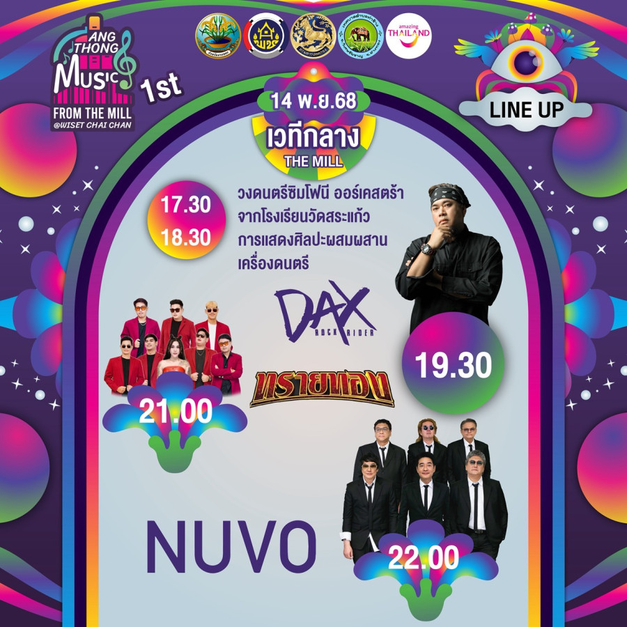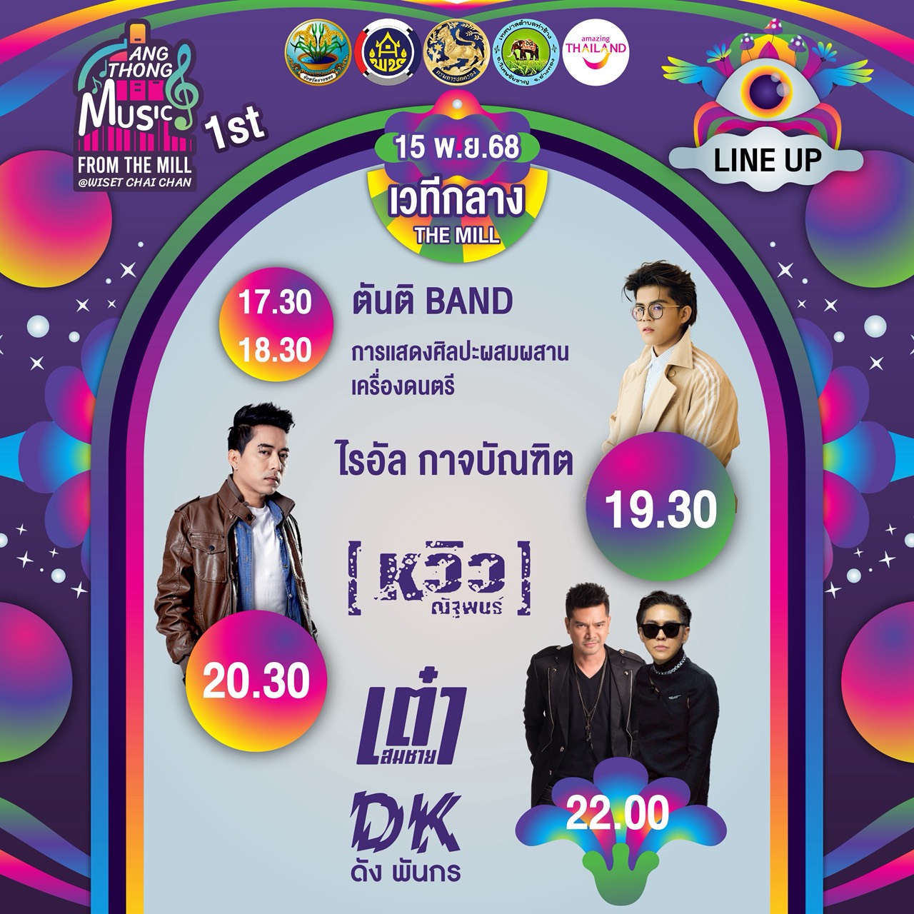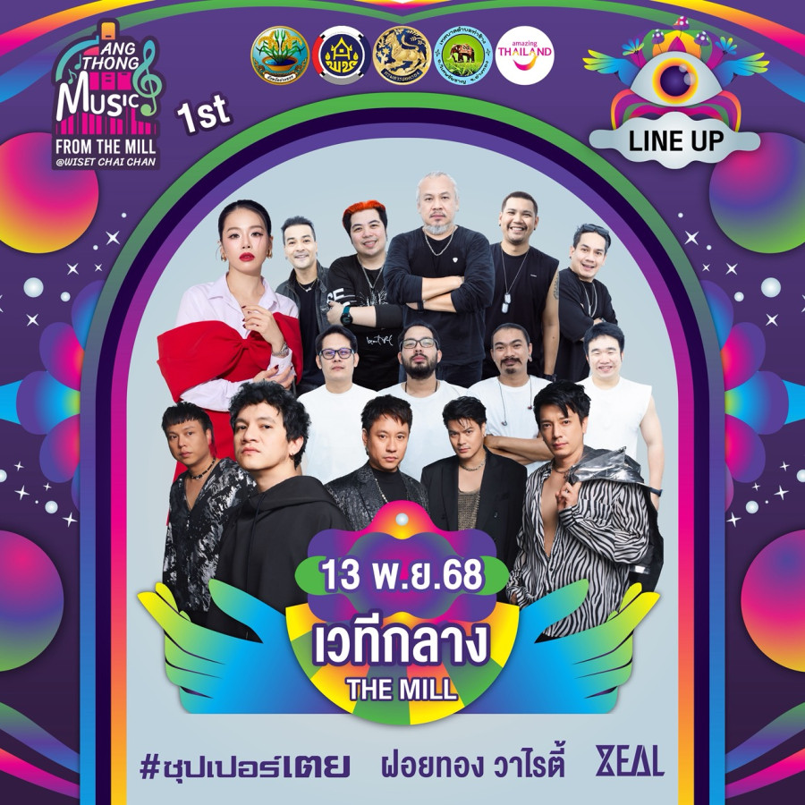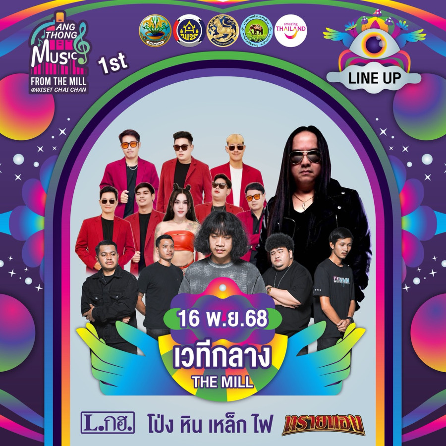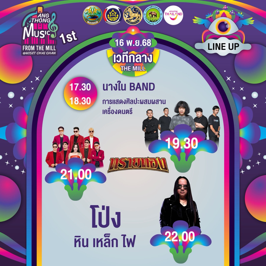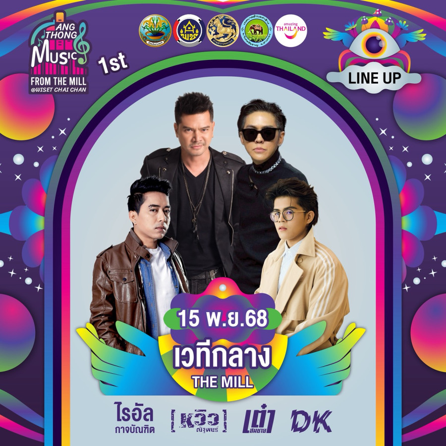 ANG THONG MUSIC FROM THE MILL @ WISET CHAI CHAN คือเทศกาลดนตรีที่จัดขึ้นท่ามกลาง “โรงสีเก่า”อันมีเสน่ห์ของอำเภอวิเศษชัยชาญ ที่ครั้งหนึ่งเคยเป็นหัวใจของการค้าข้าวในอ่างทอง และวันนี้ได้กลายเป็นเวทีแห่งเสียงเพลง แสง สี เสียงสุดอลังการ