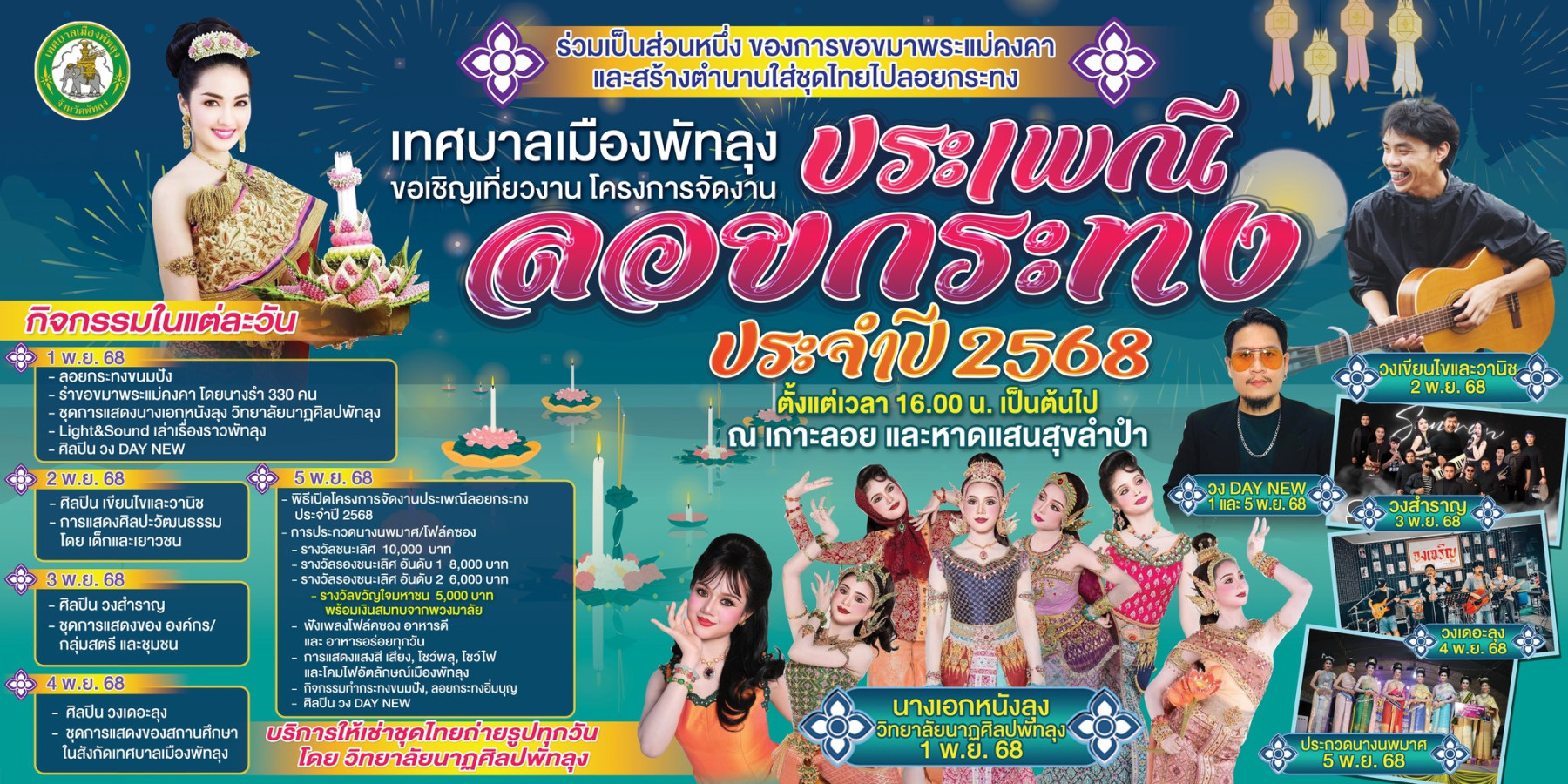 เมื่อค่ำคืนแห่งพระจันทร์เต็มดวงมาเยือน 🌝 เทศบาลเมืองพัทลุงขอเชิญทุกท่านร่วม ขอขมาพระแม่คงคา และสัมผัสมนต์เสน่ห์แห่งงาน “ประเพณีลอยกระทง ประจำปี 2568”