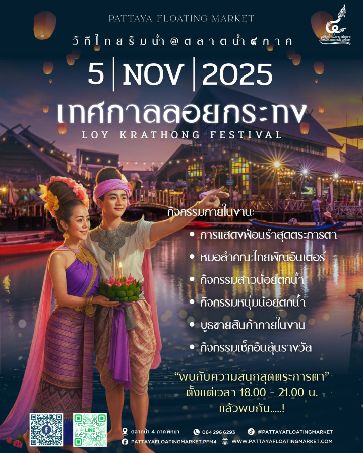 และปีนี้ “เทศกาลลอยกระทง 2568” ที่ ตลาดน้ำ 4 ภาค พัทยา จังหวัดชลบุรี ก็พร้อมต้อนรับนักท่องเที่ยวทุกคนให้มาร่วมสืบสานประเพณีไทยอันงดงาม ในบรรยากาศอบอุ่นหัวใจ ❤️