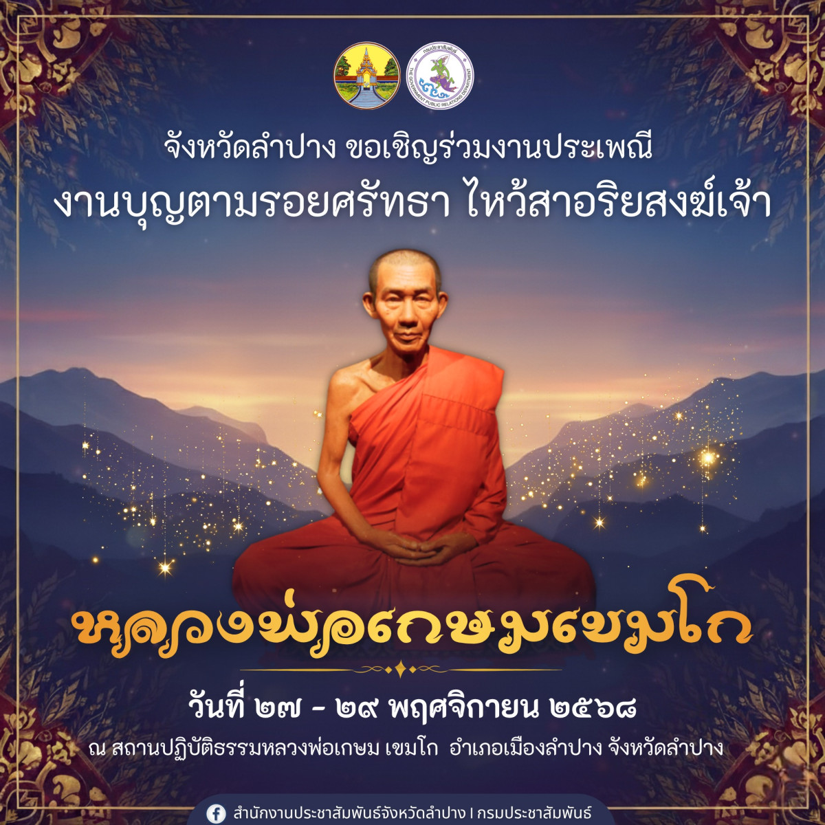 เสียงสวดมนต์แผ่วเบาดังก้องไปทั่วบริเวณสถานปฏิบัติธรรมหลวงพ่อเกษม เขมโก 🌾 กลิ่นธูปหอมกรุ่นปะปนกับเสียงระฆังยามเช้า ชวนให้ใจสงบเย็น “งานบุญตามรอยศรัทธา ไหว้สาอริยสงฆ์เจ้า หลวงพ่อเกษม เขมโก” คือเทศกาลแห่งศรัทธาอันยิ่งใหญ่ของชาวลำปาง ที่ทุกปีจะมีผู้คนจากทั่วสารทิศหลั่งไหลมาร่วมงาน เพื่อรำลึกถึงพระเกจิผู้เปี่ยมด้วยเมตตาและธรรมะอันลึกซึ้ง 🙏